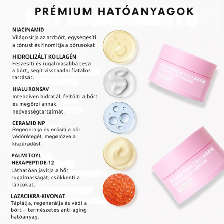 A PDRN pink kollagén kapszula krém egyedülálló formulája kifejezetten a 40 feletti bőr igényeihez készült. A pasztell rózsaszín kapszulákban friss, koncentrált hatóanyag-keverék rejtőzik: hidrolizált kollagén, hialuronsav, niacinamid, ceramid és lazacikra-kivonat.