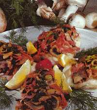 Egy nagy kivajazott tûzálló tálban egymás mellé fektetjük a halfiléket, a gombás-sonkás-olajbogyós ragut a tetejére halmozzuk, és 750 wattal 10 percig pároljuk. Tálalás előtt 2 percig állni hagyjuk, majd apróra vágott petrezselyemmel, egészen más jellegû lesz, ha kaporral megszórva tálaljuk. Ne felejtsünk el egy-egy citromgerezdet kínálni hozzá.